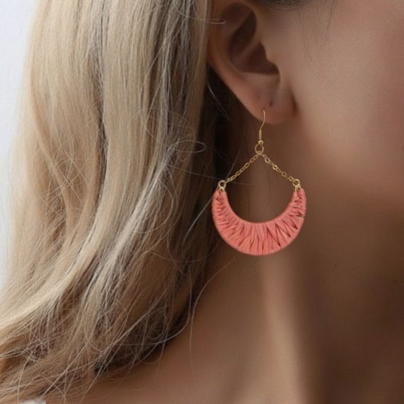 بافت رافیا ظاهری خاص و هنری ایجاد می کند. همین ویژگی باعث می شود گوشواره رافیا برای استایل های بوهمیان، مینیمال، ساحلی و روزمره کاملاً مناسب باشد.