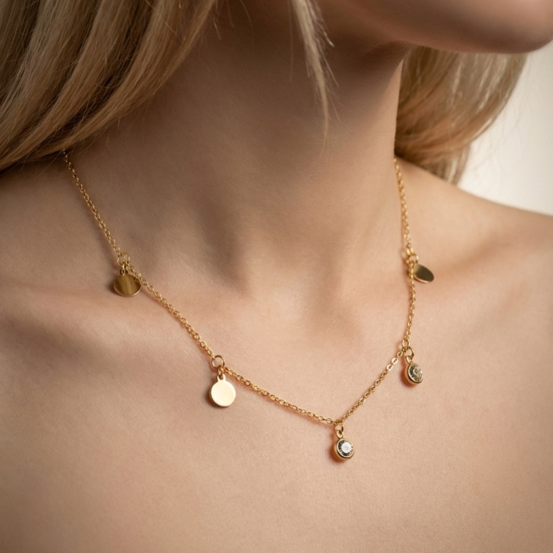 گردنبند زنانه پولکی نگین دار در میان انواع اکسسوری ها یکی از تأثیرگذارترین و جذاب ترین گزینه ها محسوب میشود؛ به ویژه زمانی که از برندی معتبر همچون I AM یا six انتخاب شود.